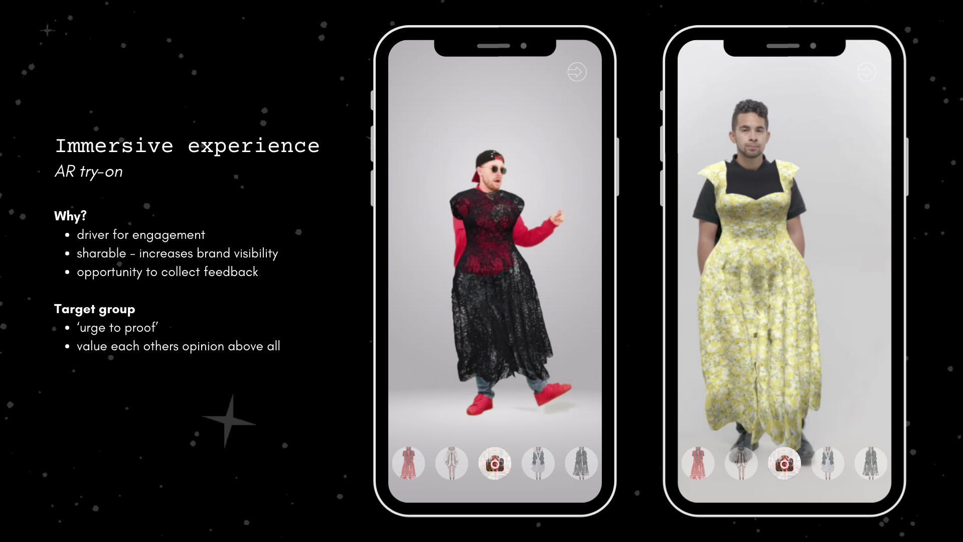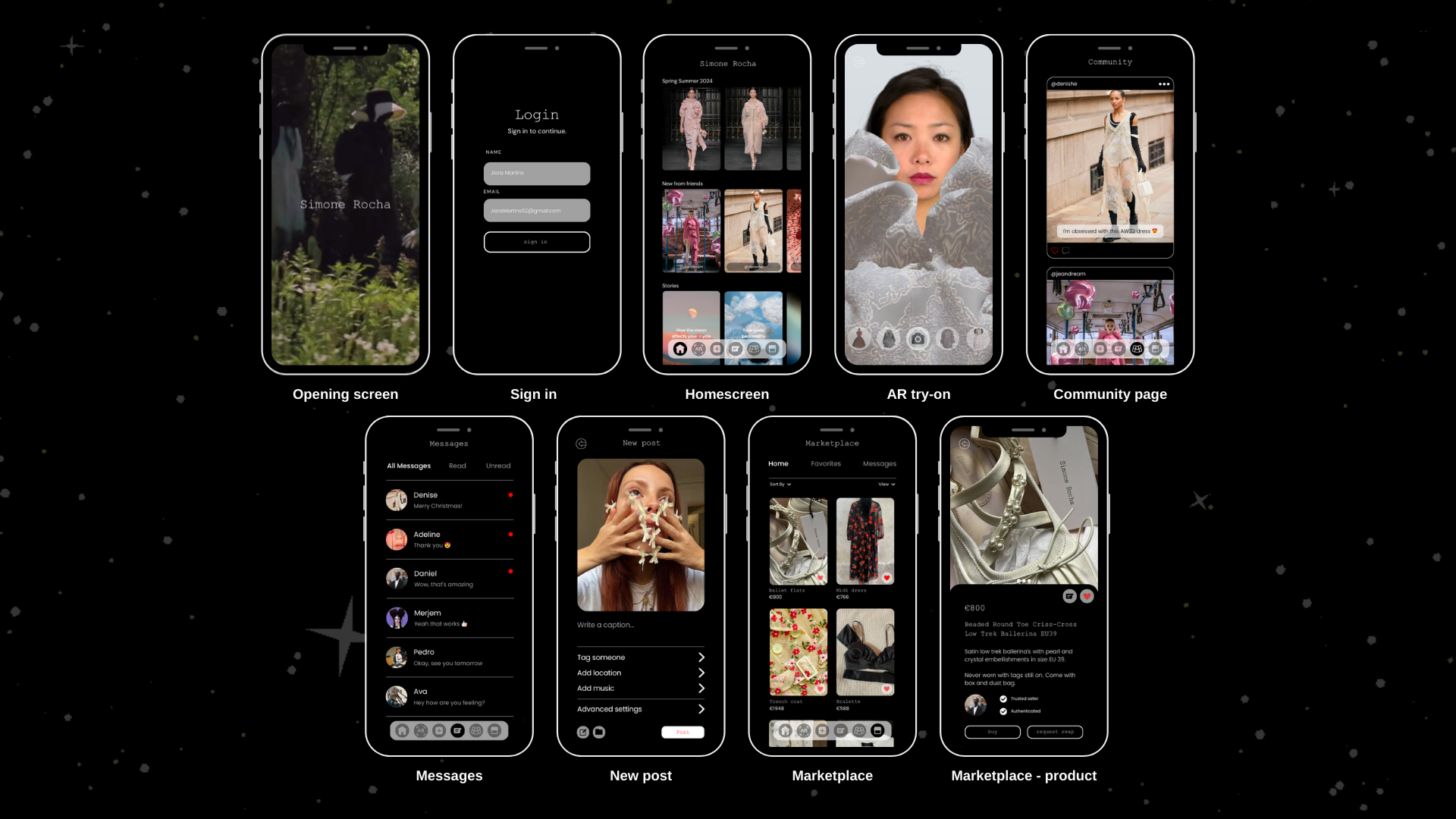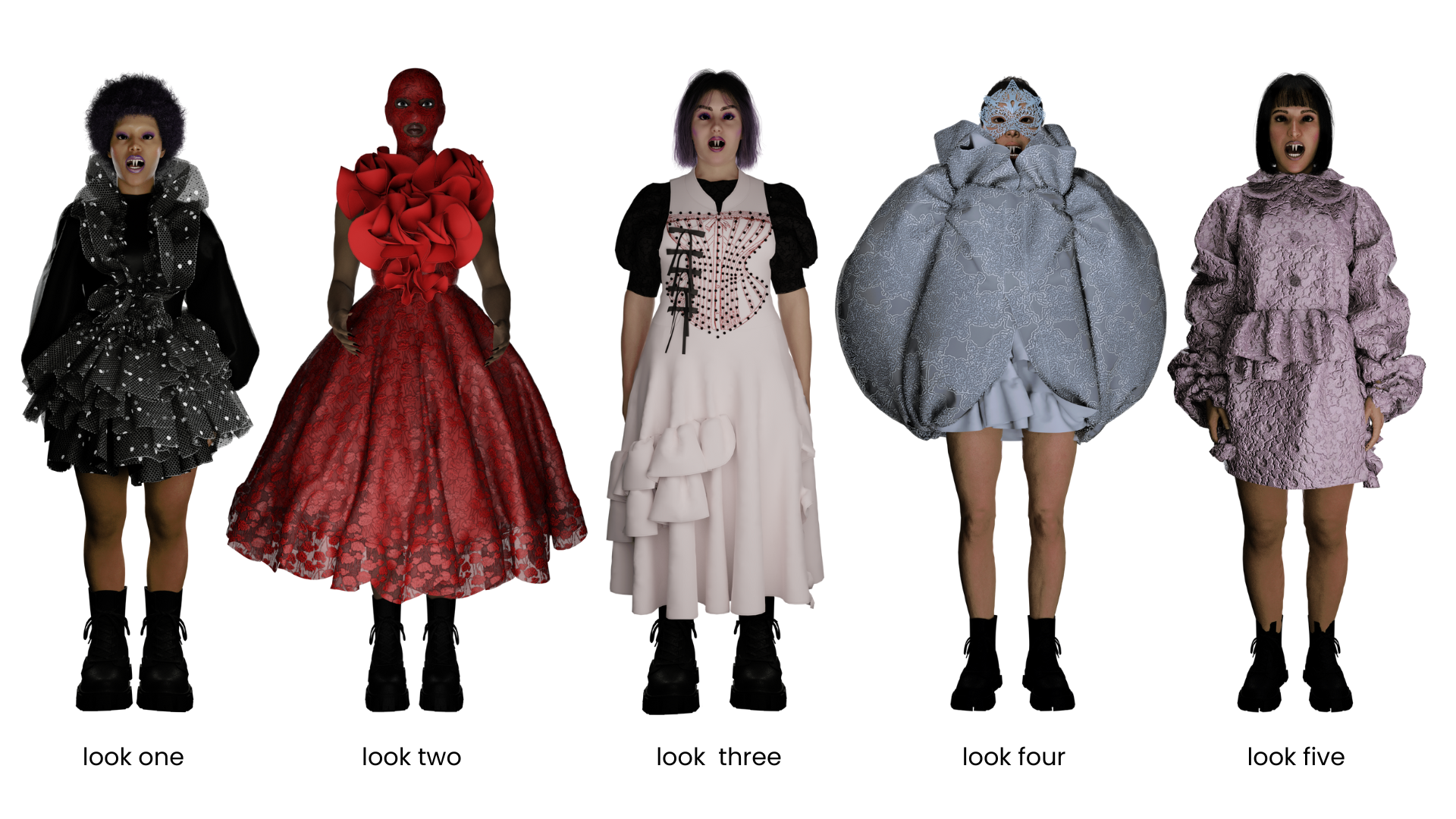 Through extensive research and experimentation, I developed a fully digital collection, including a unique avatar for each look, and I created all the textiles from scratch. I used AI image generators to create the prints and motifs used. Alongside the collection, I designed a community app prototype and developed an AR try-on filter for each look in the collection. My objective with this project was to research how a brand like Simone Rocha can utilise technology in order to drive connection within their brand community, and how they can translate the fabrication of textiles to the digital world of fashion. To read my research report, click here.